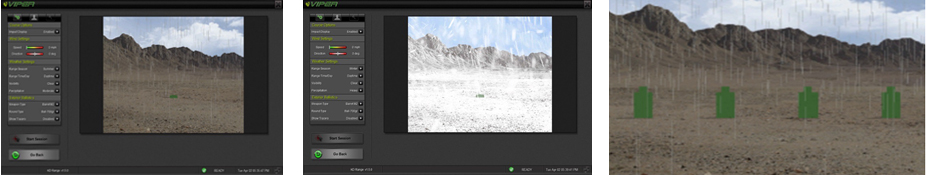 This graphic shows the “instructor view” on the monitor. The instructor can create new courses or edit existing ones at any time. As you can see the screen is neat, and easy to use. This allows the instructor to focus on the students and the training at all times. Weather can be added or changed which will allow the student to see the effect on the ballistics. The above image shows snow whilst the image to the right shows rain. Any other type of weather can also be added. Any targets can be added to match current qualification courses. Up to four targets per screen and a moving target can be authored at any one time.