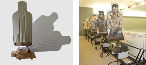 The TG 82-70 BRP Target Mechanism is designed for mobile use in electronic target ranges or on moving trolleys and permits realistic training with live ammunition using small arms and rifles of different calibres. The equipment is ideal for operation in built-up areas. A bank of TG 82-70 BRP Target Mechanisms can be directly controlled or pre-programmed and can be operated singly, in pre-selected groups or simultaneously with all other mechanisms by the Range Control System (RCS). The mechanism is pre-programmed with a set of standard target functions. Using either the radio controller (HHC) or the Range Control System (RCS) a wider range of functions is available.